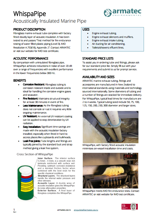 Whispapipe is a Factory Insulated Marine Exhaust Tubing.  An Armatec innovation to save you installation time is our marine exhaust tubing that comes fitted with acoustic insulation. This greatly reduces installation time in the limited spaces available where the pipework is run; the acoustic insulation is already done. The acoustic insulation is fitted without gaps ensuring better acoustic performance.